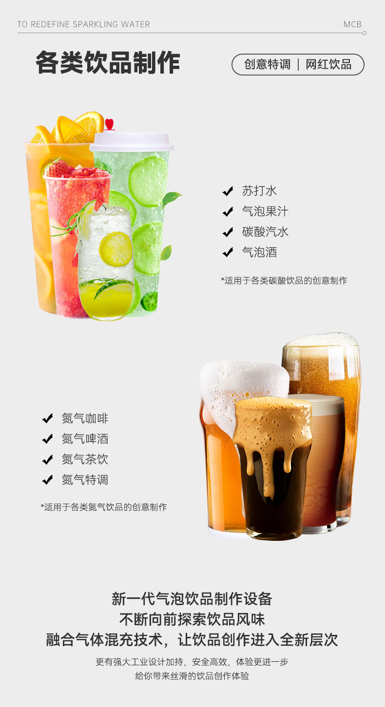 MCB魔法師PRO專為氣體飲品設(shè)計!能現(xiàn)場制作氮氣咖啡,含氣飲品等多種品類。助力連鎖咖啡,精釀啤酒屋,高端餐飲店,酒吧夜店等多場所,隨時隨地打造氣泡飲品,通過一客一彈,減少前期大型設(shè)備的投入,減少日常品類的備貨需求,提升飲品師工作效率。